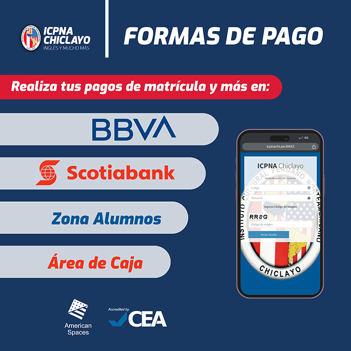 El Instituto Cultural Peruano Norteamericano de Chiclayo respeta y cumple con la ley (Decreto Ley N.° 822) y disposiciones del Instituto Nacional de Defensa de la Competencia y la Protección a la Propiedad Intelectual INDECOPI, por lo que no permite el uso de fotocopias de los textos y materiales de estudio / enseñanza en clase por parte de alumnos y/o docentes.